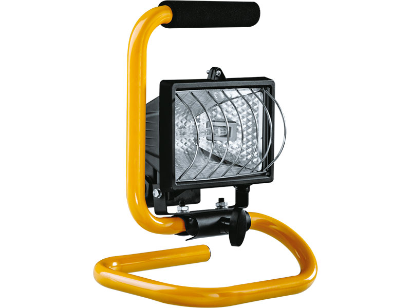 Прожектор галогенный 150Вт переносной служит для освещения больших помещений или внешних территорий, например автостоянки, футбольного поля или склада. Выполнен из алюминиевого сплава, стойкого к коррозии. Корпус прожектора покрыт порошковой краской. Термостойкое стекло защищает от перепадов температур, оно защищено металлической решеткой от разбивания. Прожектор оснащен металлической подставкой и ручкой для переноса.